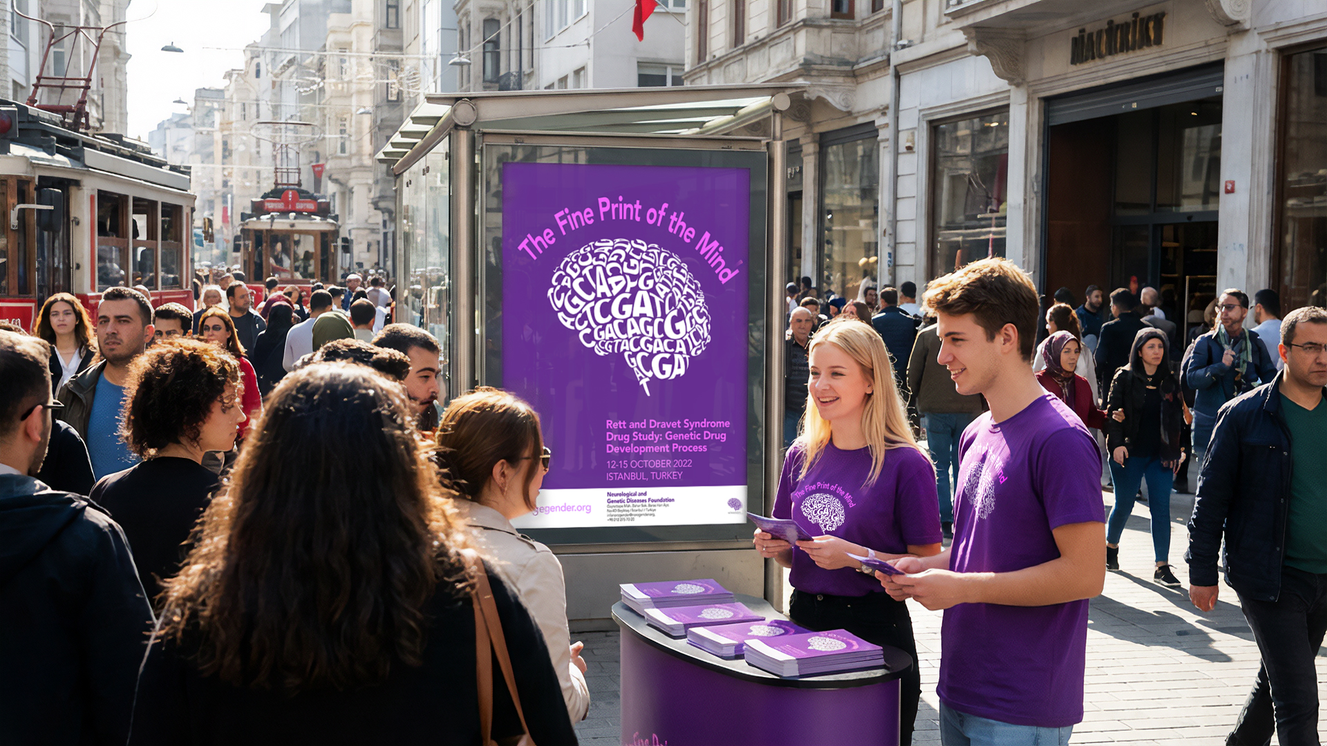 The new branding provided the foundation with a memorable, professional, and visually striking presence. The purple-themed street marketing elements created immediate visibility in a crowded city center (Istanbul), successfully drawing attention to their mission and priority research areas, specifically the platform for genetic treatments for Rett and Dravet Syndrome.